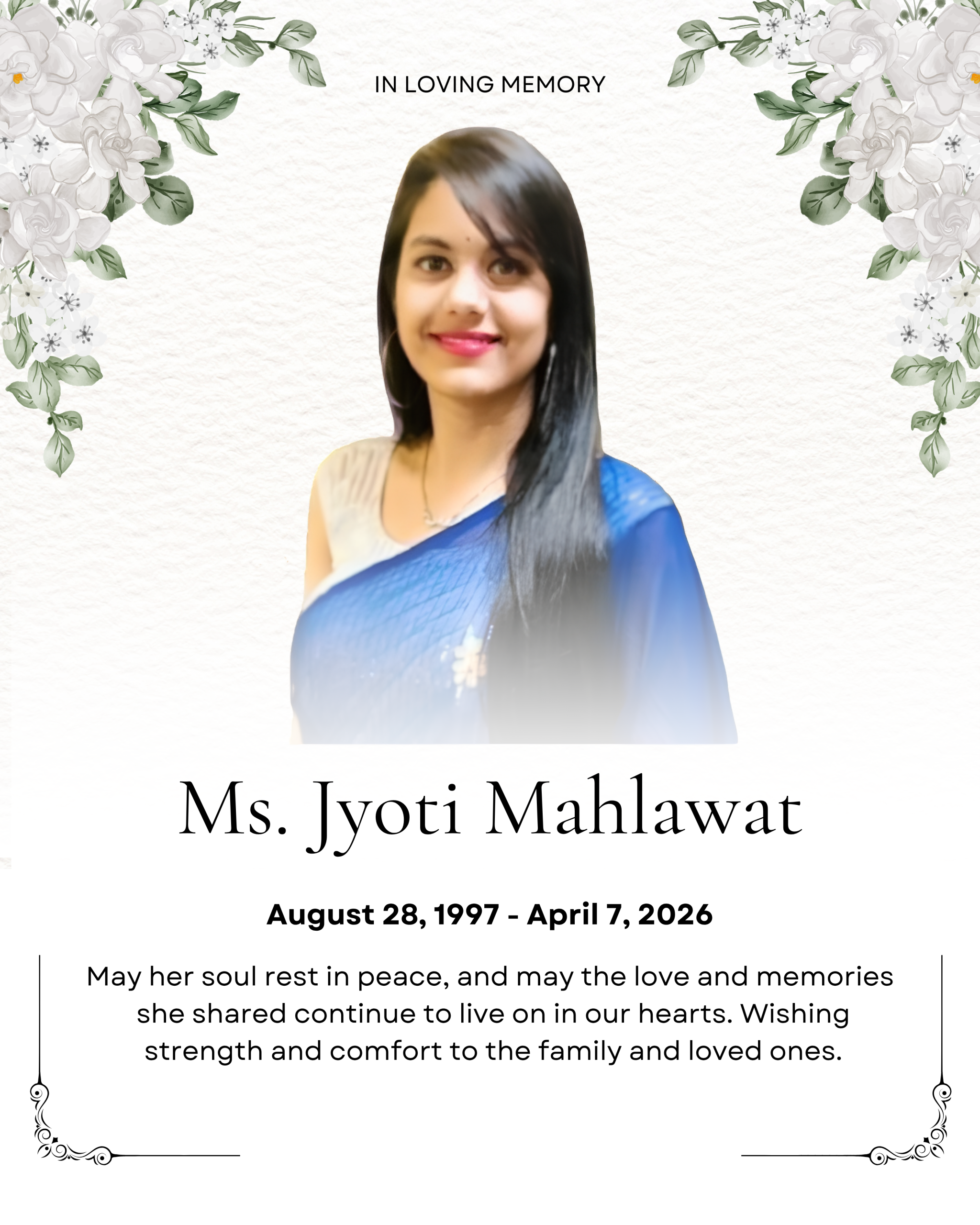 Ms. Jyoti Mahlawat passed away on 7th April 2026 after a prolonged illness. She was a PhD scholar and a kind-hearted soul whose presence brought warmth to our department.